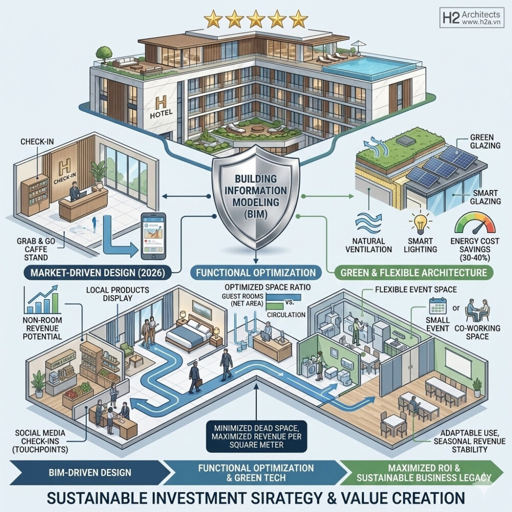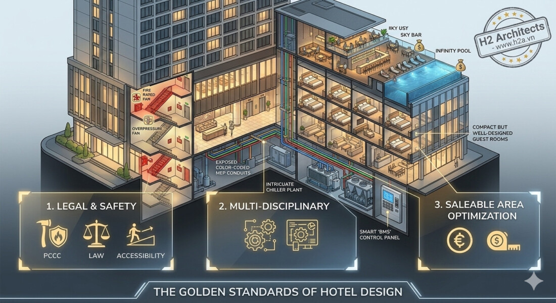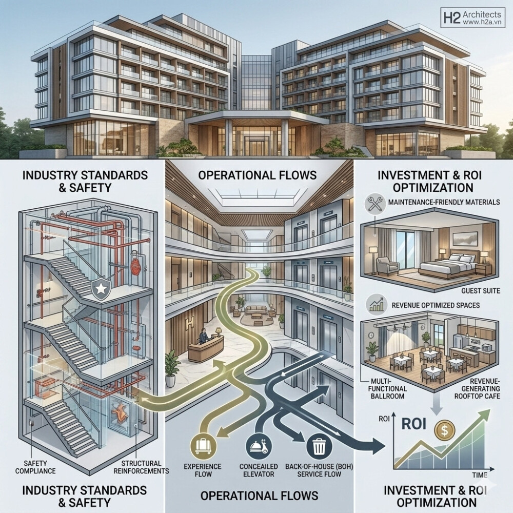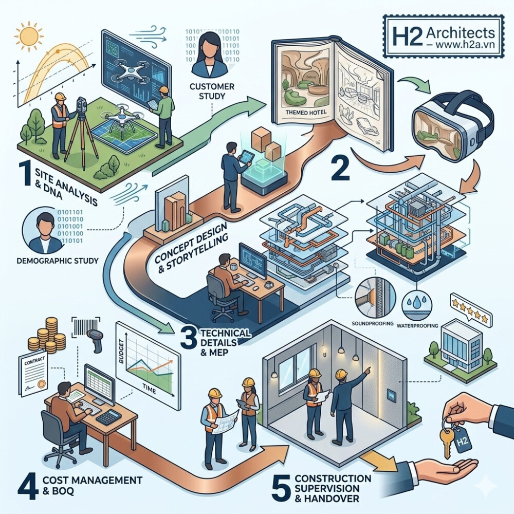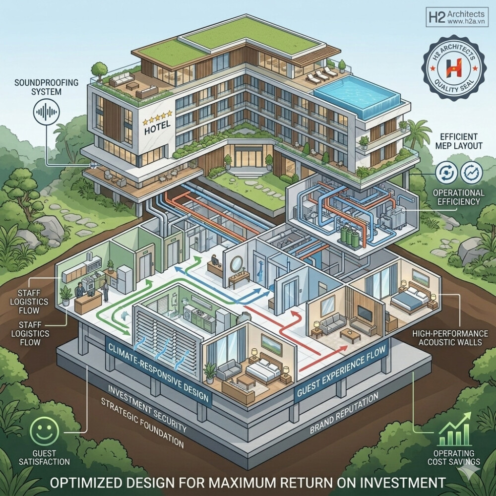 Lời kết từ Kiến trúc sư: Một khách sạn thành công là sự tổng hòa của một tầm nhìn đầu tư nhạy bén và một đơn vị thiết kế có tâm. H2A không chỉ xây nên những công trình, chúng tôi cùng bạn xây dựng một thương hiệu lưu trú trường tồn.