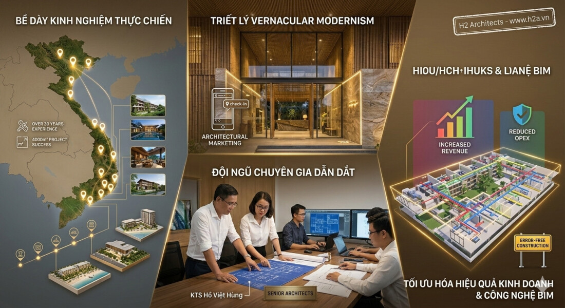 Giữa thị trường kiến trúc đang bão hòa với những thiết kế rập khuôn, việc tìm kiếm một đối tác không chỉ “biết vẽ” mà còn “biết thấu hiểu” giá trị kinh doanh và bản sắc địa phương là bài toán sống còn của mọi chủ đầu tư. H2 Architects (H2A) tự hào khẳng định vị thế là đơn vị thiết kế khách sạn và khu nghỉ dưỡng uy tín hàng đầu, nơi mỗi bản vẽ là một cam kết về sự thịnh vượng và tính nghệ thuật bền vững.