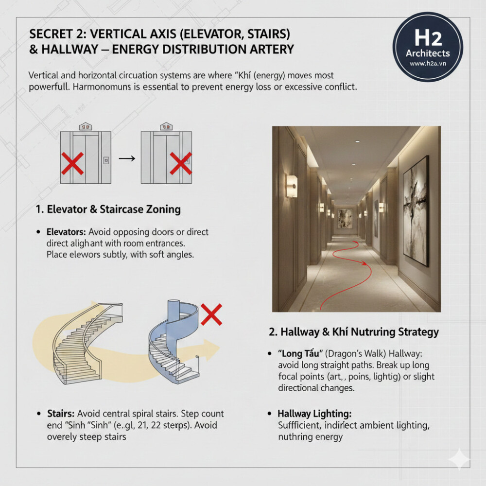 Hệ thống lưu thông theo chiều dọc và chiều ngang là nơi Khí chuyển động mạnh mẽ nhất. Sự bố trí hợp lý là cần thiết để Khí không bị hao tán (Thoát Khí) hay quá mạnh gây xung đột (Sát Khí).