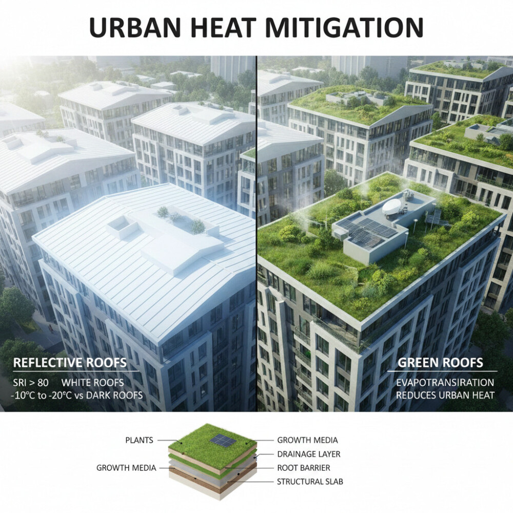 Đối với các khu vực không thể làm Mái Xanh, sử dụng vật liệu lợp mái có Chỉ số Phản xạ Mặt trời (SRI – Solar Reflectance Index) cao hơn 80. Sơn hoặc màng lợp màu trắng có khả năng phản xạ phần lớn ánh nắng mặt trời, giữ nhiệt độ bề mặt mái thấp hơn $10^\circ\text{C} – 20^\circ\text{C}$ so với mái tối màu.