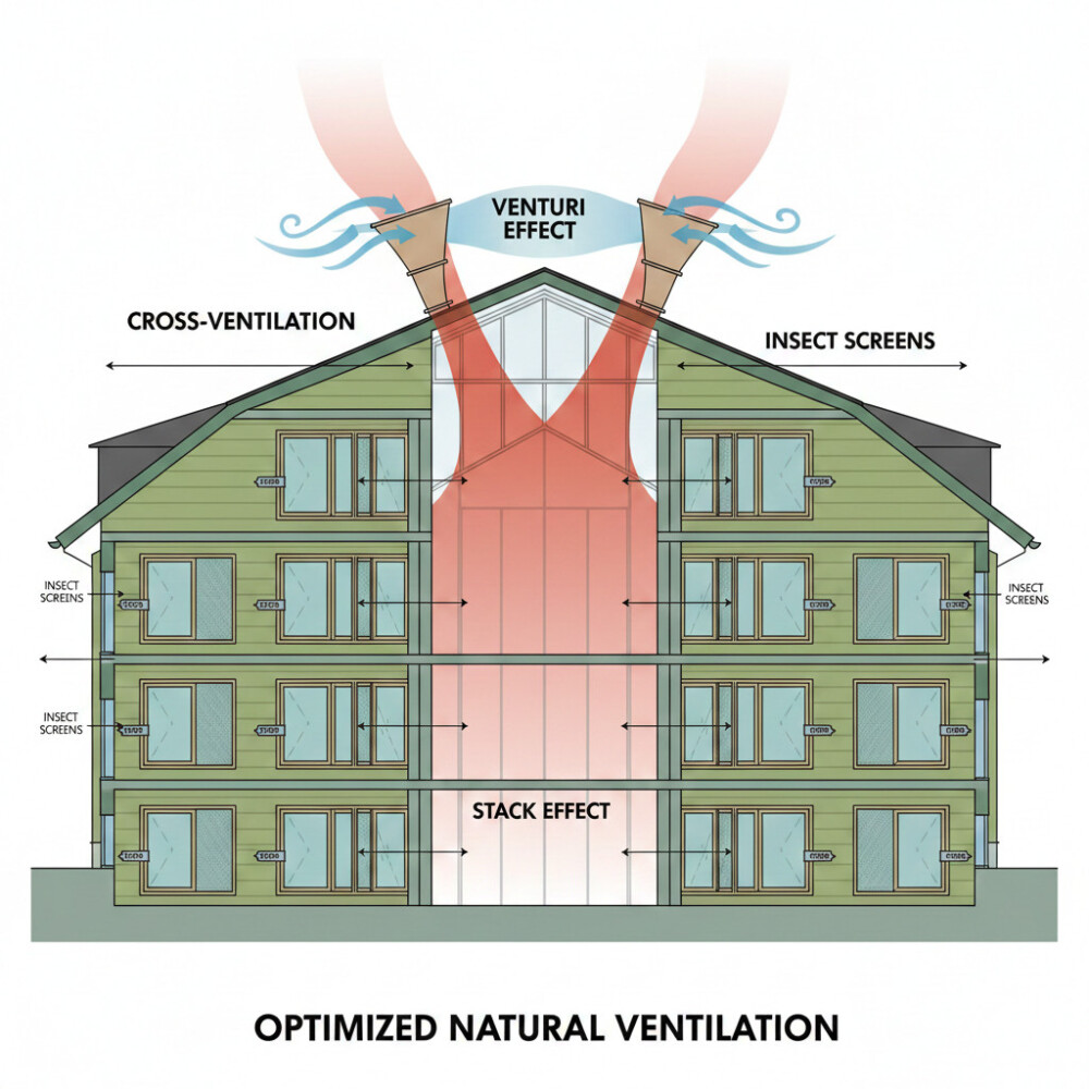 2. Tối ưu hóa Thông gió Chéo (Cross-Ventilation) và Ống Khói (Stack Effect)