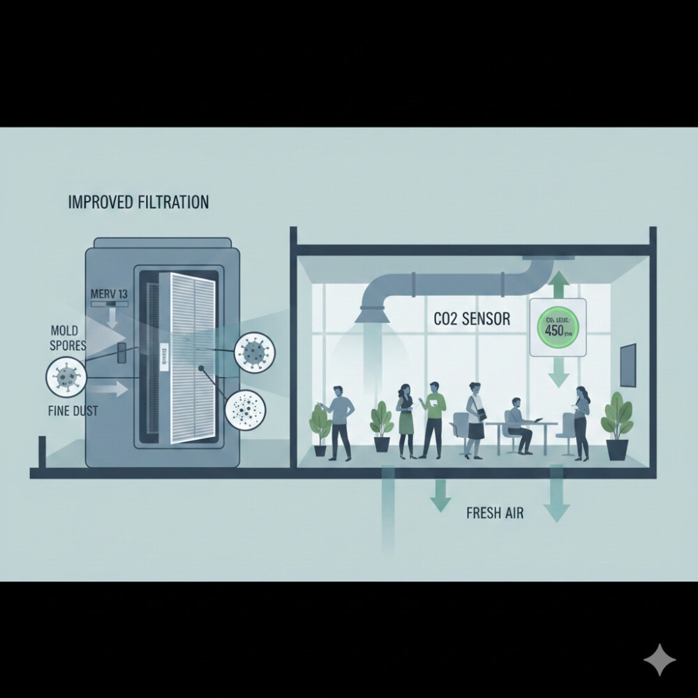 Tích hợp Bộ lọc MERV 8/13: Tăng cường bộ lọc không khí tiêu chuẩn (MERV 8) lên MERV 13 ở các khu vực kín, giúp loại bỏ các hạt nhỏ như bào tử nấm mốc và bụi mịn. -