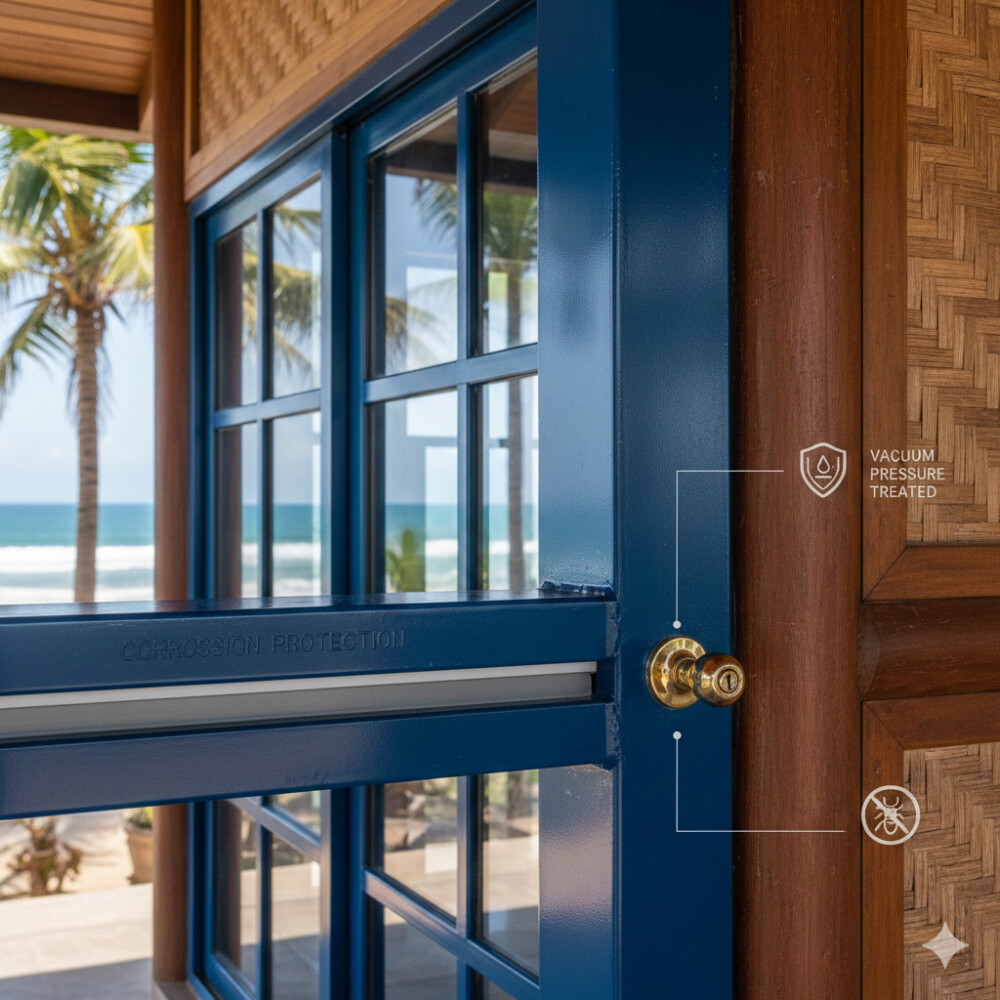 Bảo vệ Thép và Kim loại: Tất cả các kết cấu thép và phụ kiện kim loại (bao gồm cả khung cửa sổ, tay nắm) trong thiết kế khách sạn ven biển phải được mạ kẽm nóng (Hot-dip Galvanizing) và sau đó được sơn phủ Epoxy hoặc Polyurethane để bảo vệ kép khỏi sự ăn mòn của muối biển. -