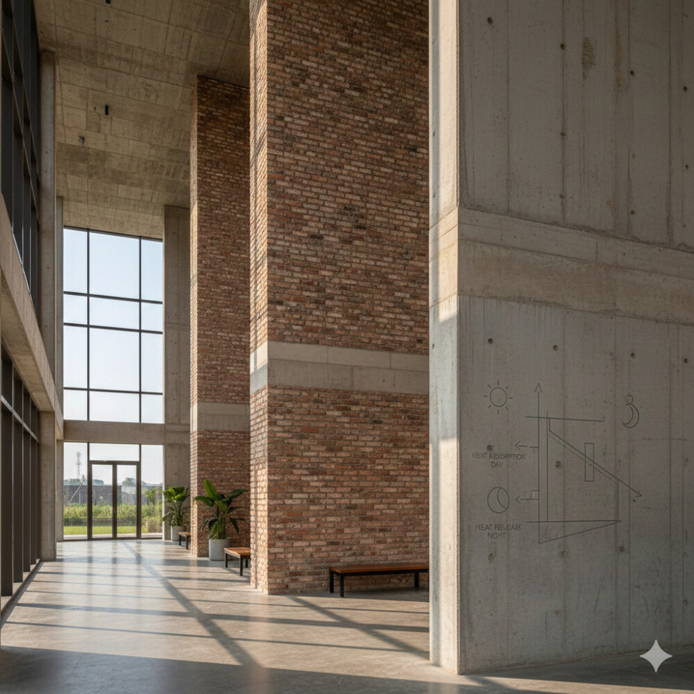 Tường Gạch Lớn/Bê tông: Sử dụng tường gạch đặc hoặc bê tông dày cho các khu vực ở tầng trệt và lõi trung tâm. Khối lượng nhiệt lớn này giúp trì hoãn sự truyền nhiệt từ ban ngày sang ban đêm. Nó hấp thụ nhiệt vào ban ngày và tỏa nhiệt ra khi nhiệt độ môi trường giảm, giúp làm mát thụ động vào buổi tối.